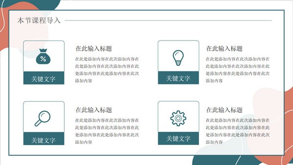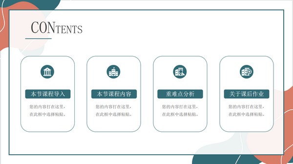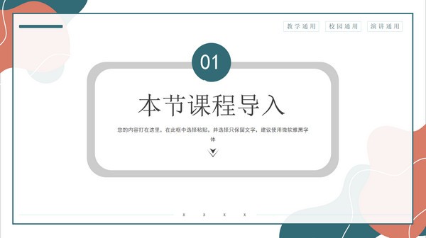 简约校园教师教学通用PPT模板很适合老师开展课堂教学时使用,可以帮助用户轻松制作出教学所需的课件,模板的风格看起来很舒适,上面带有简单的色块图案,能够很好地吸引学生们的目光和兴趣,让课件展示得更加有效,格式为PPT文档,页面清晰直观,内容丰富,便于用户直接修改。