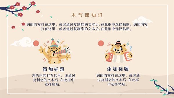 可爱卡通老虎教学通用ppt模板,画风非常可爱的非常多的人都在使用人用的一款PPT,采用了今年虎年的主题,里面绘制了非常多的人都在使用形态的小老虎形象,比如有拿着小红花表白的、吹喇叭庆祝的、弹奏乐器的还有呼呼大睡的,还融入了梅花、圆月、祥云等国风元素,具体样式可以参考下文图示,十分好看。
