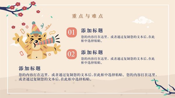 可爱卡通老虎教学通用PPT模板画风可爱童趣,用来制作虎年的教学PPT再合适不过了,模板里面的内容都是可以自由修改的,欢迎大家下载使用~