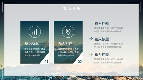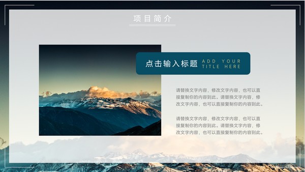 商务风项目计划书ppt模板,这款PPT风格比较适合正式场合,采用的是山川风景图片为背景,内容包括项目简介、公司概述、项目规划、时市场分析、投资回报等,都是可以自行编辑修改的,源文件为.pptx格式,欢迎有需要的朋友们在本站下载使用。