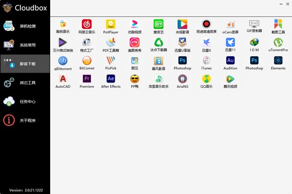 在装机过程中如果需要下载各种应用可以试试这款Cloudbox工具箱软件,这是一个非常全面又非常方便的工具箱,包含了许多非常实用的程序应用,版本也比较齐全,能够为用户安装系统提供许多便利,同时还具备了装机检测、影音下载等功能,一共包含四种类型的工具,全面满足用户的使用需求。