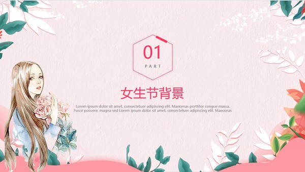PPT模板以粉色为主题色,水彩风格设计制作。PPT封面使用了水彩绘制植物、花卉,和一位短发女生背景图片。中间首页粉色字体填写三七女生节PPT标题。界面风格清新唯美。