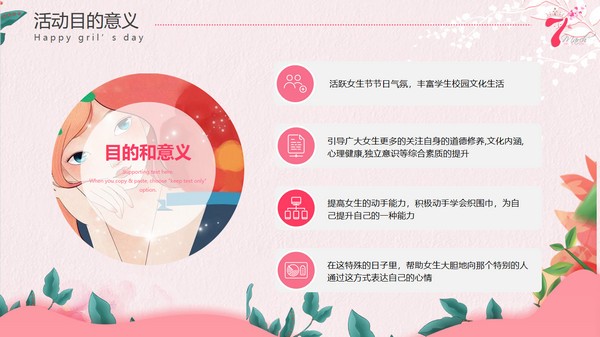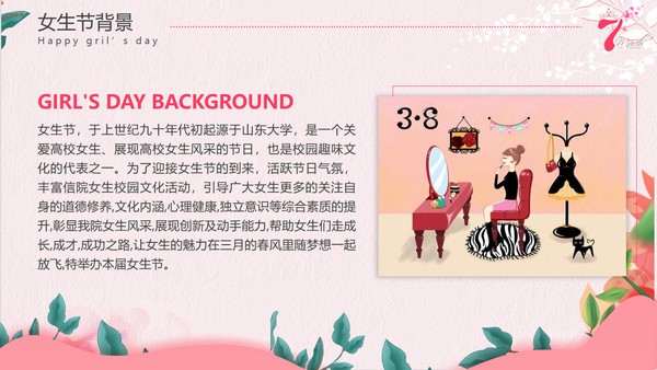PowerPoint模板内容页,由多张女生插图、女生节活动插图等,搭配PPT文案排版。