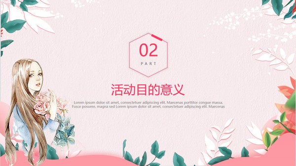 这是专门用于三七女生节活动的非常多的人都在使用人用的一款活动策划方案ppt模板,共22页,以粉色为主题色,画风十分清新唯美,源文件为PPT格式模板,喜欢的话可以直接下载套用~