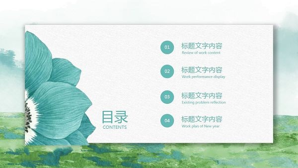 软件能够用来制作PPT演示文档,是一个美观又非常实用的模板,里面包含了多个板块,整体风格为绿色清新的春天主题背景,带有美丽的水彩画元素,让人感觉赏心悦目,展示效果很不错。