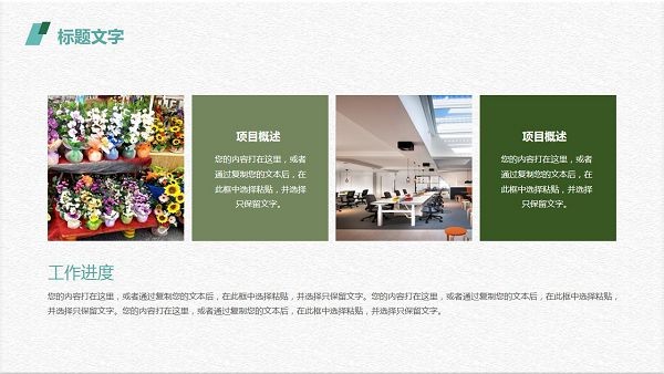 PowerPoint模板内容页,由18张绿色动态幻灯片图表,搭配PPT文字排版。另外使用了多张植物盆栽插图、小清新办公桌面插图等装饰。