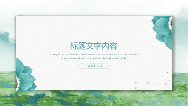 PPT模板封面使用了绿色水彩绘制的草地、花朵背景图片。中间放置带有阴影效果的矩形文本框,填写PPT标题文字。界面风格绿色清新。