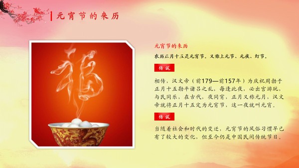 古典喜庆元宵节主题班会PPT模板的内容包含了元宵节的来历、元宵节的传统、元宵节的美食、元宵节的活动以及元宵节的发展意义,支持编辑修改。