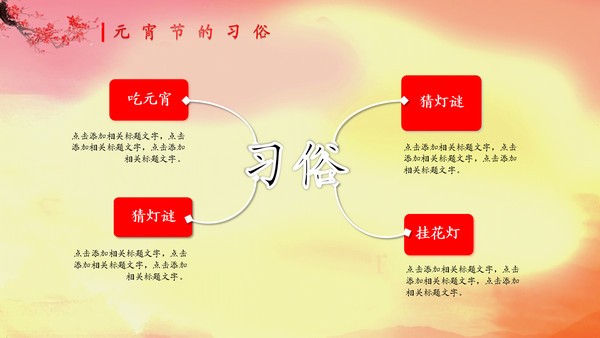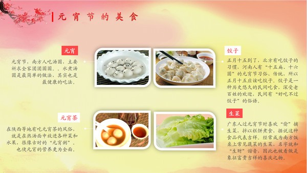 PowerPoint模板内容页,由22张红色动态幻灯片图表,搭配元宵节介绍文字排版。另外使用了元宵节风俗活动插图、元宵节美食插图等装饰。