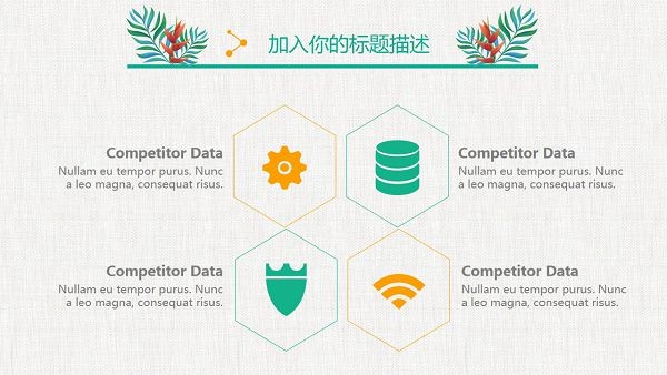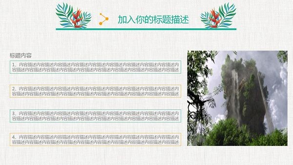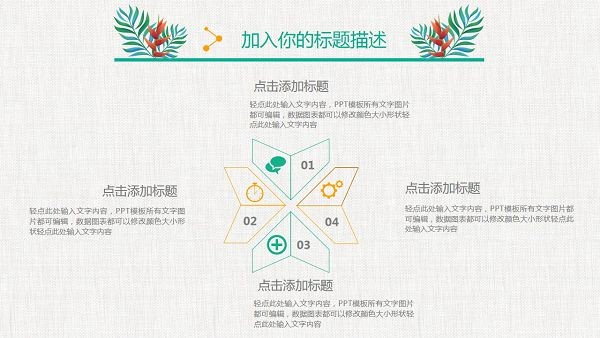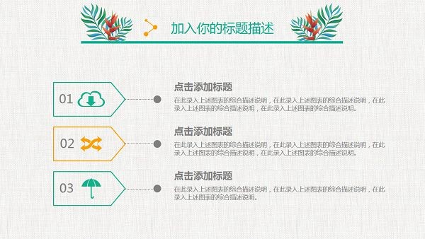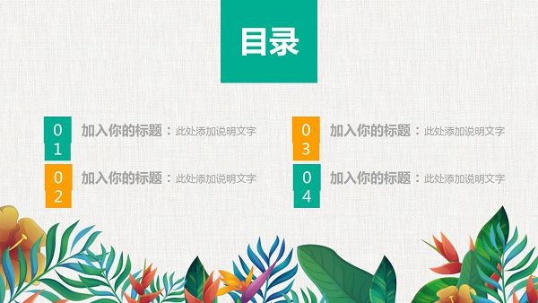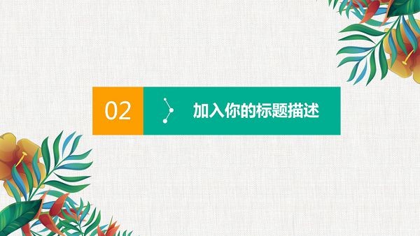 精美彩色叶子清爽夏季PPT模板具有很强的通用性,可以应用在多种场景中,这款模板采用了夏季热带树叶的设计风格,颜色十分鲜艳亮眼,上面带有各种彩色叶子的图片素材,整体很美观,可以帮助用户制作出精美的PPT演示文档,从而更好地进行展示,适合做教学课件或者产品推广。