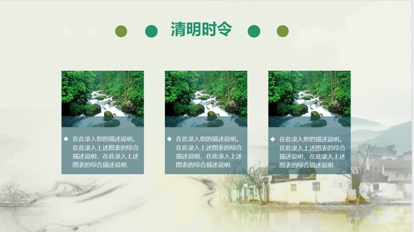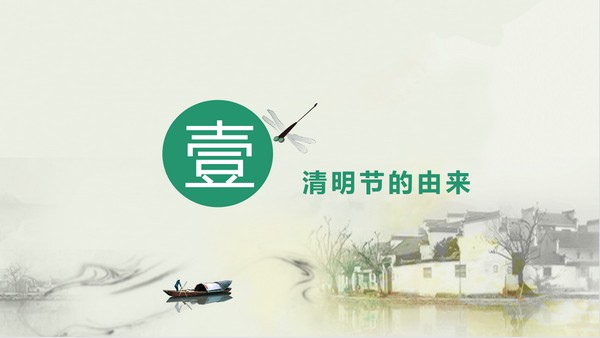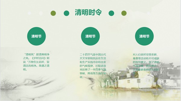 PPT模板采用了绿色水彩绘制的,雨中的群山、古代乡村、绿叶植物等背景图。中间放置清明PPT艺术字。界面简洁清爽,背景元素与清明PPT主题搭配。