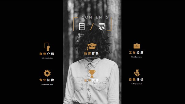 软件采用了PPT演示文档的格式展示,能够让用户的简历看起来更加整洁清晰,设计风格偏文艺,黑金色的色调看起来十分优雅,免费提供下载,直接根据个人经历修改内容即可。