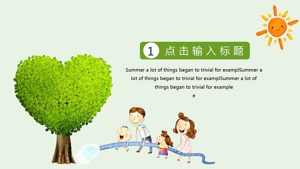 PPT模板采用了卡通风格设计制作。PPT模板封面一家四口,拿着水果给爱心形状的绿树浇水。左上角填写我们一起去植树PPT标题。PPT背景与植树节PPT主题搭配。