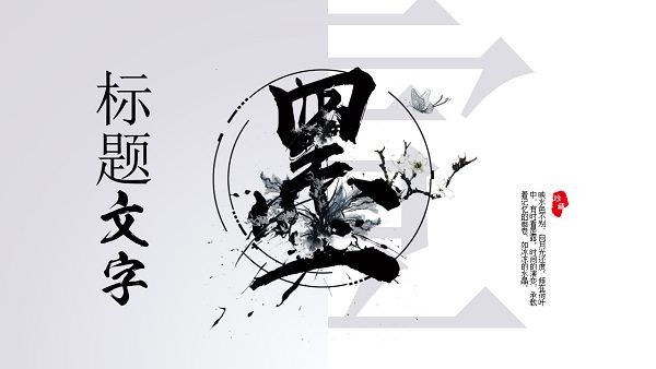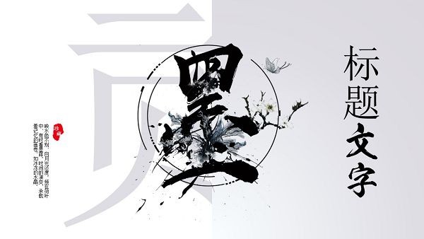 PPT模板封面,使用了淡雅灰色背景,中间使用毛笔字书写水墨PPT标题,标题中放置梅花花卉点缀,非常具有创意。