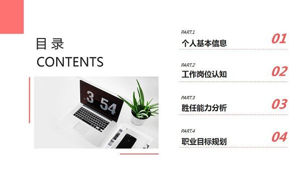 PPT模板封面左侧放置摆放了笔记本电脑与手机的办公桌面背景图片。右侧填写转正述职报告PPT标题。周围使用红色线条装饰。界面风格大气商务。