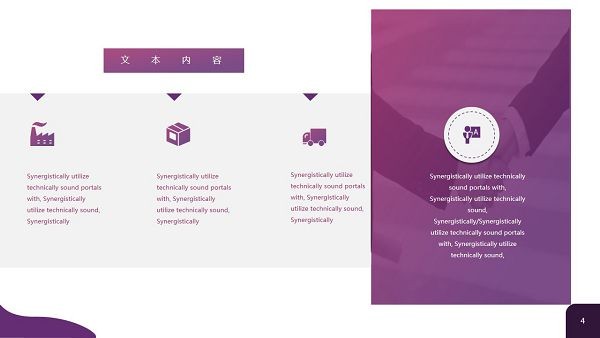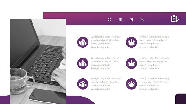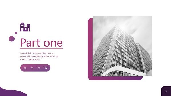 PowerPoint模板内容页,由23张紫色渐变幻灯片图表,搭配英文文字排版。另外使用了黑白商业建筑插图、办公桌面插图、职场人物插图等装饰。