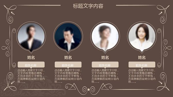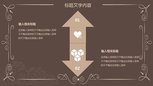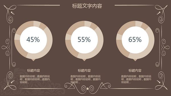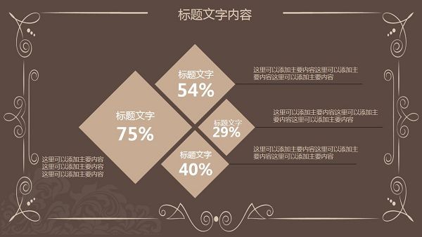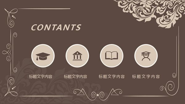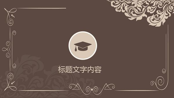PPT模板采用了棕色作为主色调。PPT封面使用了古典花纹边框,和植物图案背景图片。中间填写PPT标题文字。界面古典朴素。