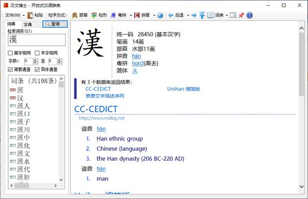 免费的电子词典、字典检索功能,有统一汉字(Unihan)14.0、异体字及构形数据库、汉字笔顺、康熙字典、说文解字、国语词典、CC汉英词典等三十多部字典和词典。