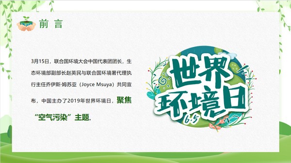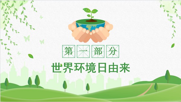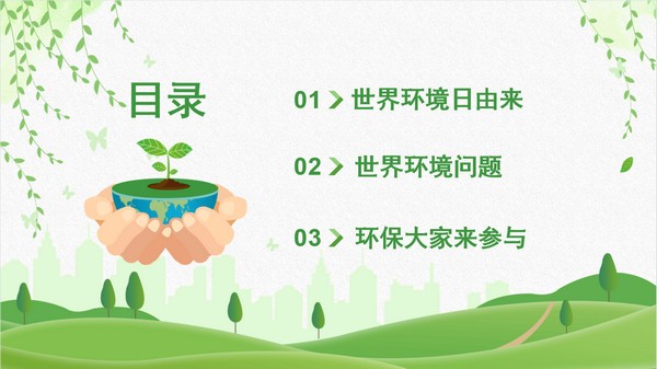 绿色小清新风格,介绍了世界环境日由来、世界环境问题、环保大家来参与。