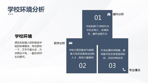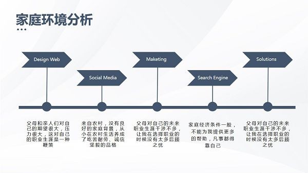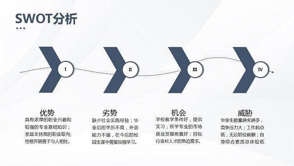 软件的整体色调为深蓝色,设计风格十分简约,没有多余的装饰元素,很适合用来制作大学生的职业生涯规划书,从而更好地分析和规划未来发展,让学生们对自己的人生有更深的认识。