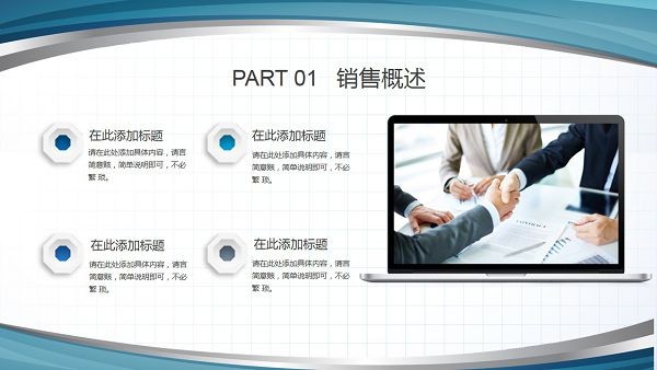 PowerPoint模板内容页,由22张蓝色动态扁平化PPT图表制作。另外使用了握手图片、电脑图片等排版。
