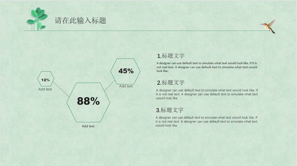 幻灯片模板使用了淡雅绿色作为底色。PPT模板封面使用了一枝精致绿叶作为背景图片。右侧填写工作计划PPT标题文字,并且使用一直小鸟作为装饰。界面设计简洁清新。
