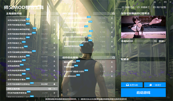 师父MOD整合工具是小编专门为喜欢师父的小伙伴们准备的,是非常多的人都在使用人用的一款内容很丰富的mod合集包,里面包含了许多有趣又非常实用的补丁工具,能够帮助玩家获得更好的游戏体验,大家可以根据喜好挑选使用,一键配置,快速安装和卸载mod,可以修改游戏中的人物角色,为玩家带来全新的体验。