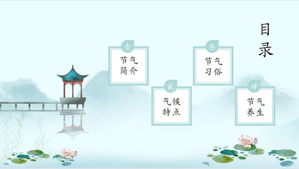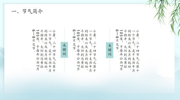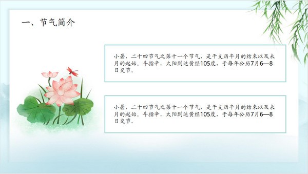 夏天是荷花的主场,粉色的荷花搭配绿色的荷叶能让人感受到一丝清凉。水墨风小暑节气介绍PPT模板采用了手绘风格的荷花荷叶、柳树、流水,很符合小暑节气的特点。