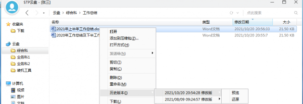 STP云盘上所有的文件都支持“历史版本”功能,系统能自动保留最近64次修改保存的记录,用户通过鼠标右键点击文件,可在历史版本菜单中“还原”或“预览”文件。