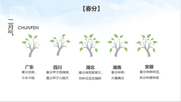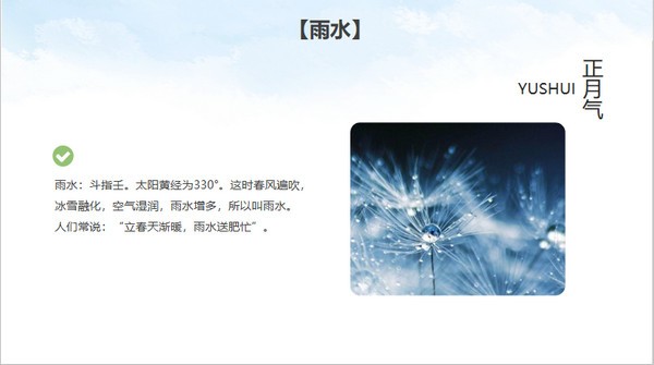 清新简洁二十四节气主题班会PPT模板对每个节气都做了详细的介绍,用户甚至不用收集节气内容,直接使用模板内的内容素材就可以了,也能让学生对二十节气有个较为清晰的认识。