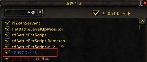 3、重启游戏(此处需要大退一下游戏),然后在插件列表中将“便利CD获取”插件勾选上。