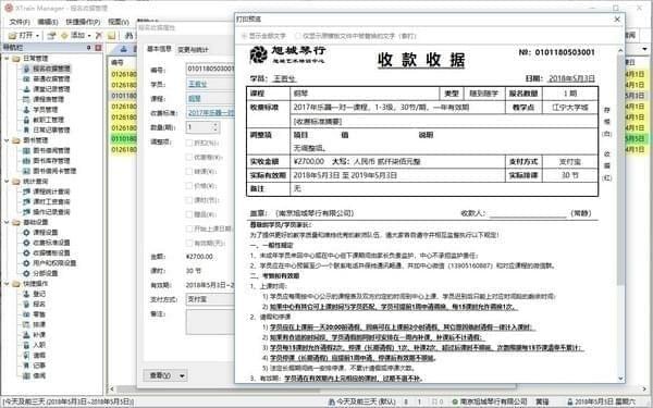 报名收据管理:以学员和课程为单位,按指定的收费标准开具和打印各课程报名收据,收据中的课时等信息是后期消排课的依据。