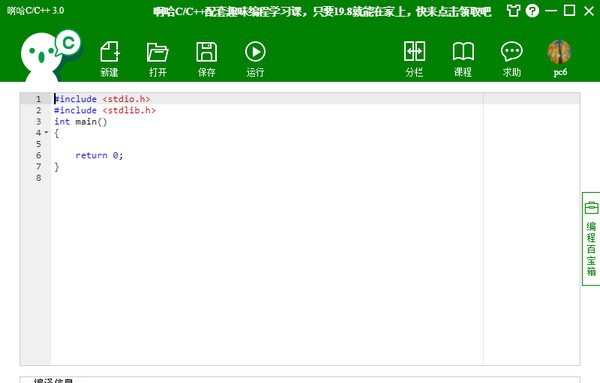 啊哈C/C++软件是款名字可爱、logo更可爱的简洁计算机语言编辑器,它支持C语言和C++语言,用户可以在线写代码,编辑计算机语言。软件的界面十分可爱,功能栏的背景颜色是绿色的,编辑界面干净简洁,用户可以随心所欲的在里面编写程序。还有丰富的功能可以使用哦。