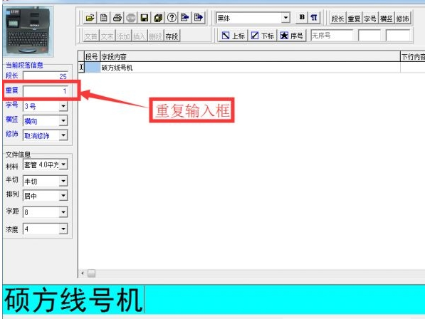 打开硕方线号机编辑软件TP Editor,输入需要打印的内容后,在软件左侧有重复输入框(如下图),直接输入需要重复的次数,范围为:1-200。
