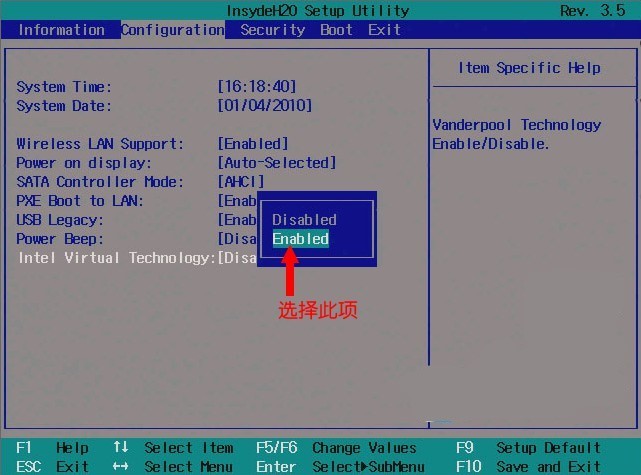 2、将光标挪动至 Enabled 处,并按下回车肯定,设置完成后,按下 F10 ,在弹出的提醒当选择 Yes,保留设置并加入 BIOS 设置。