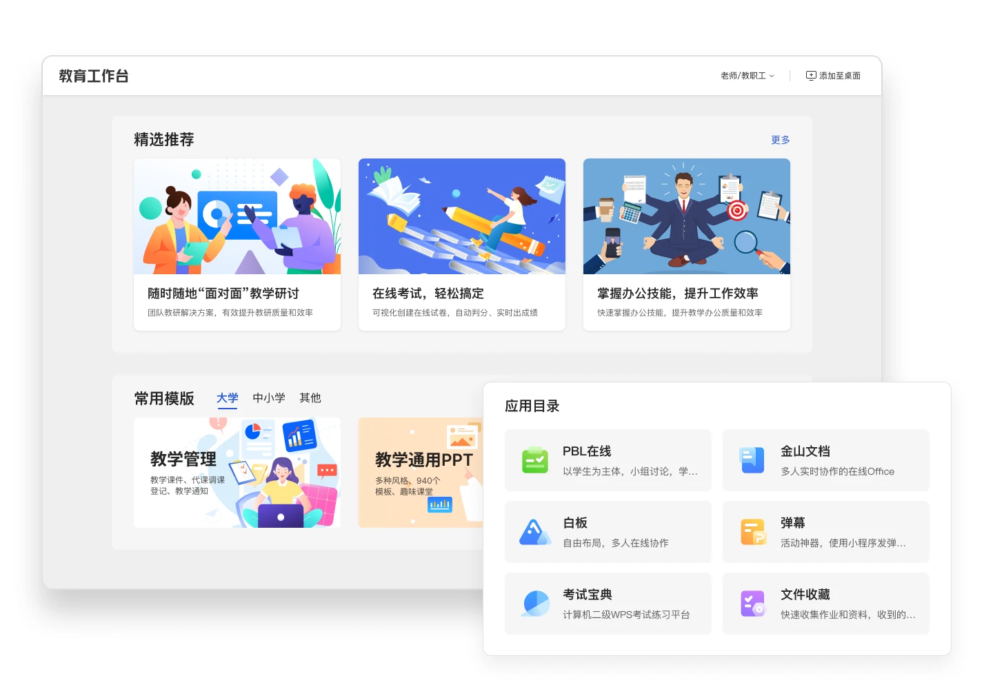 「WPS 365教育版」为教师提供了丰富的教学工具和教学素材,帮助教师更高效地备课、教学、评估、追踪和分析,省下时间专注于培养学生。