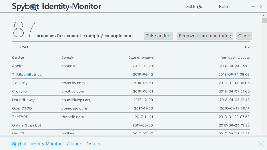 通过查看帐户详细信息,您可以大致了解帐户(在此示例中为虚拟电子邮件地址 example@example.com)泄露的位置。