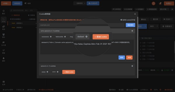 支持Cookie管理,发送接口时,可以携带自定义的Cookie进行模拟登录