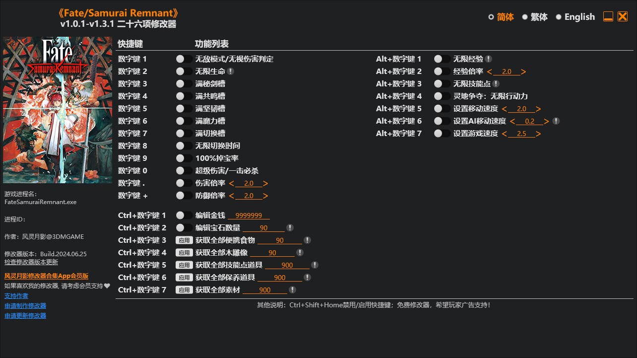 《Fate/Samurai Remnant》v1.0.1-v1.3.1二十六项修改器风灵月影版凭借全面兼容、功能丰富和操作简单等特色,为玩家提供了丰富的修改选项和便捷的使用体验。