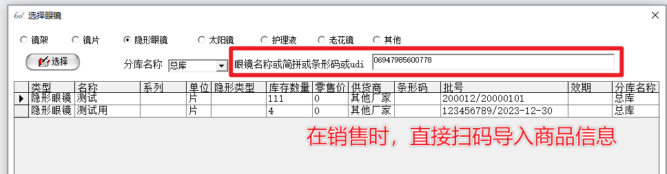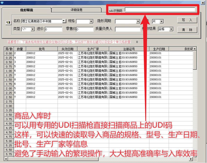 沈阳天远眼镜店管理系统做为行业领头,为了顺应法规政策要求,现已开发UDI系统,通过专用的设备,识别医疗器械产品或者包装上的由数字、字母或者符号组成的代码,来进行入库,查询,售后以及追溯的操作,该序列号