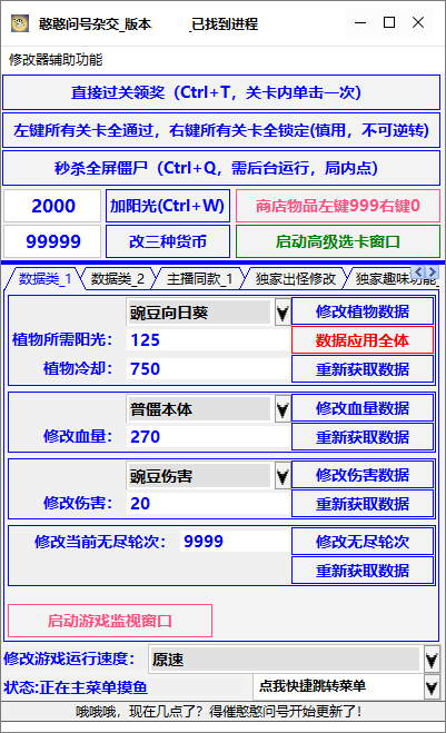 憨憨问号修改器是由”憨憨问号”作者专为植物大战僵尸杂交版制作的修改器,这款创新游戏目前十分火,但是里面的一些关卡难度很大,非常多的人都在使用玩家尝试了多次都无法顺利通关,该修改器提供了功能修改、存档等,可以辅助玩家快速通过难度高的关卡,获得更好的游戏体验。