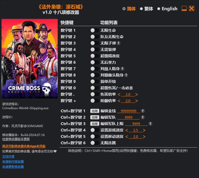 法外枭雄:滚石城十八项修改器风灵月影版是非常多的人都在使用人用的一款专为热门动作冒险游戏《法外枭雄:滚石城》打造的全方位游戏修改工具。该修改器由知名游戏修改团队风灵月影精心制作,旨在为玩家提供丰富的游戏自定义选项,从无限资源、超级能力到游戏速度调整等。