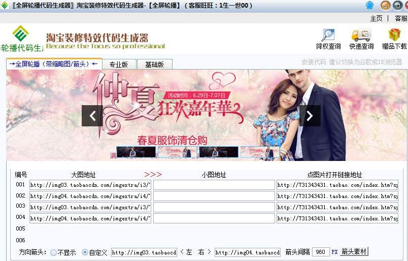 全屏轮播代码生成器淘宝美工快捷工具是专用于淘宝店铺装修的非常实用工具, 软件提供了店铺全屏轮播代码生成功能,支持旺铺专业版和基础版。